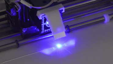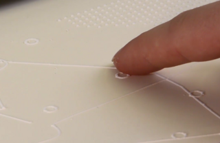Aufnahme innerhalb eines LinePod Gerätes: ein Laser erhitzt gezielt Stellen des Schwellpapiers, die unter Hitze anschwellen und fühlbar werden