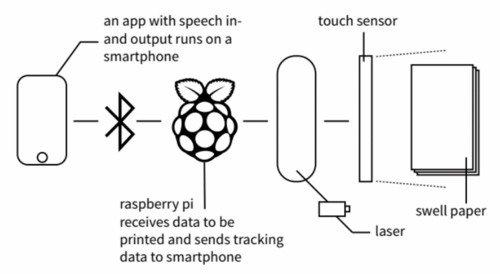 Der LinePod Stack: Smartphone mit Sprachein und -ausgabe, Raspberry Pi zur Steuerung des LinePods, LinePod mit integriertem Laser, Touchsensor zur Überwachung der Nutzerinteraktion und Schwellpapier, um dem Nutzer Informationen 2D darstellen zu können und somit blinden Nutzern 2D Exploration zu ermöglichen.
